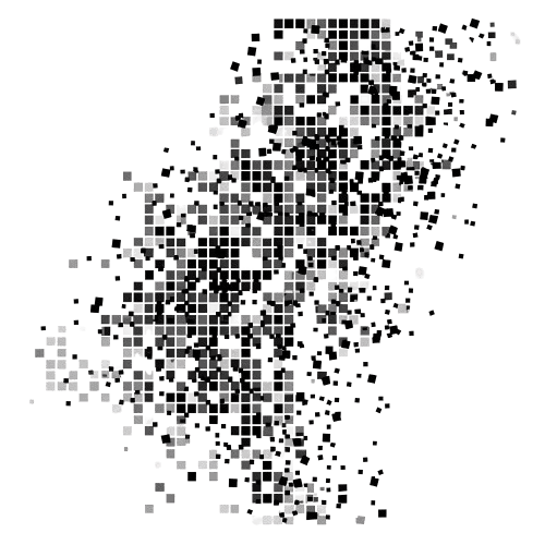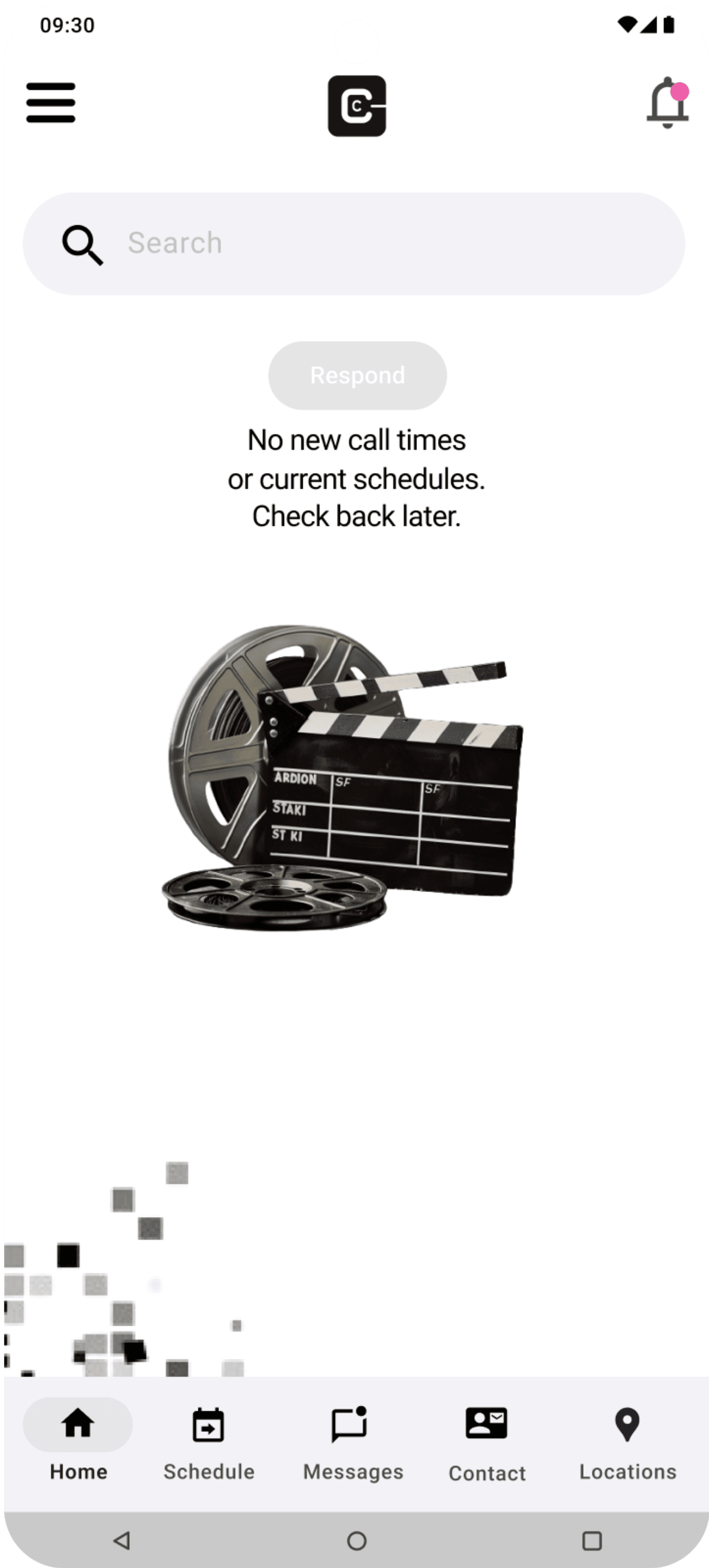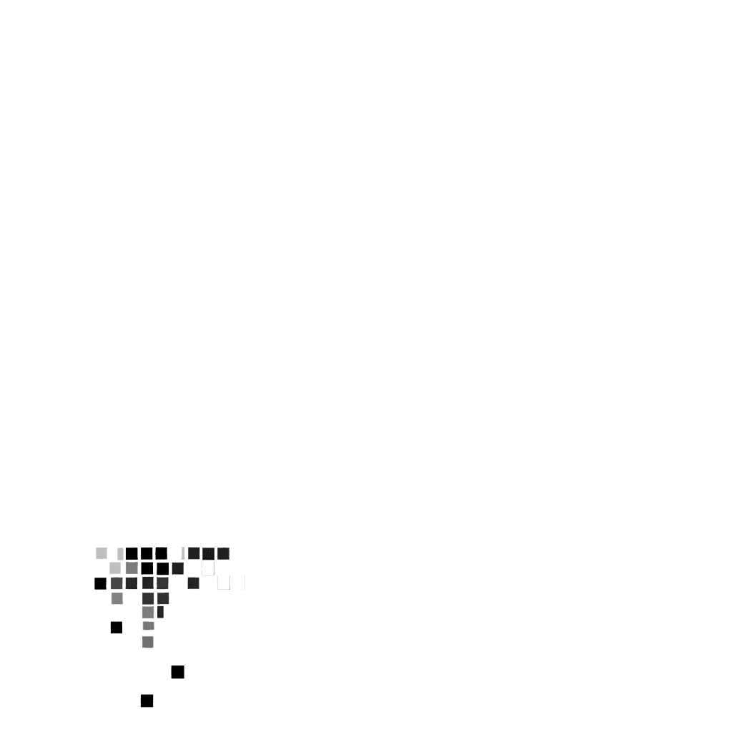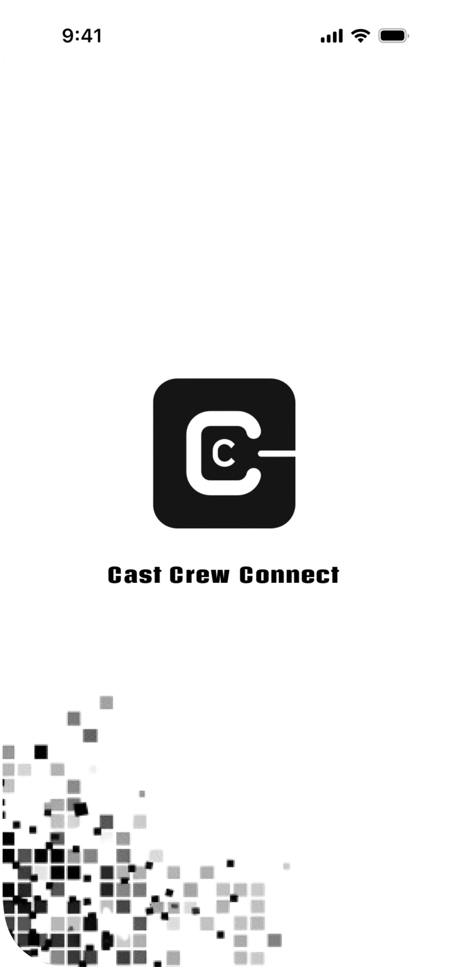 The pixelated graphic design embodies a modern, digital aesthetic that aligns with Cast Crew Connect's role as a cutting-edge communication tool for the film industry. The use of a monochromatic palette reinforces a professional and sleek look. The scattered squares reflect the dynamic and fast-paced nature of film production.