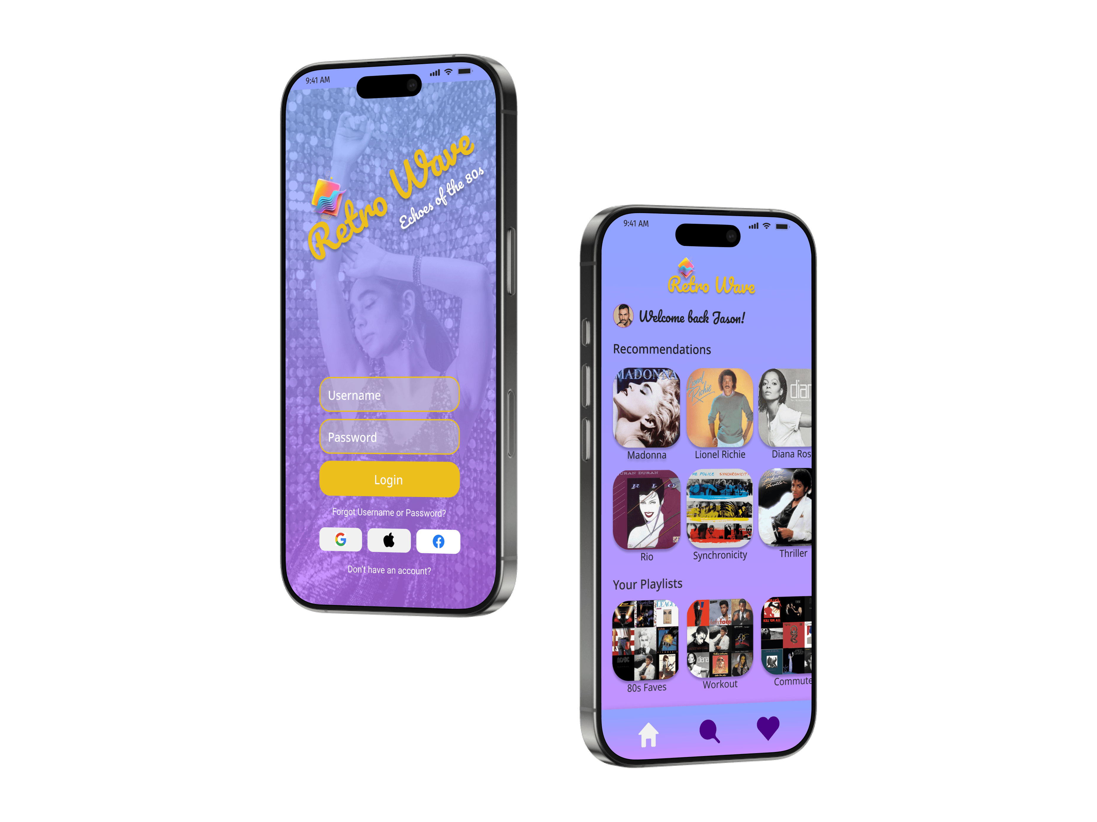 Users can browse, search, and play their favorite retro tracks while organizing personalized playlists.