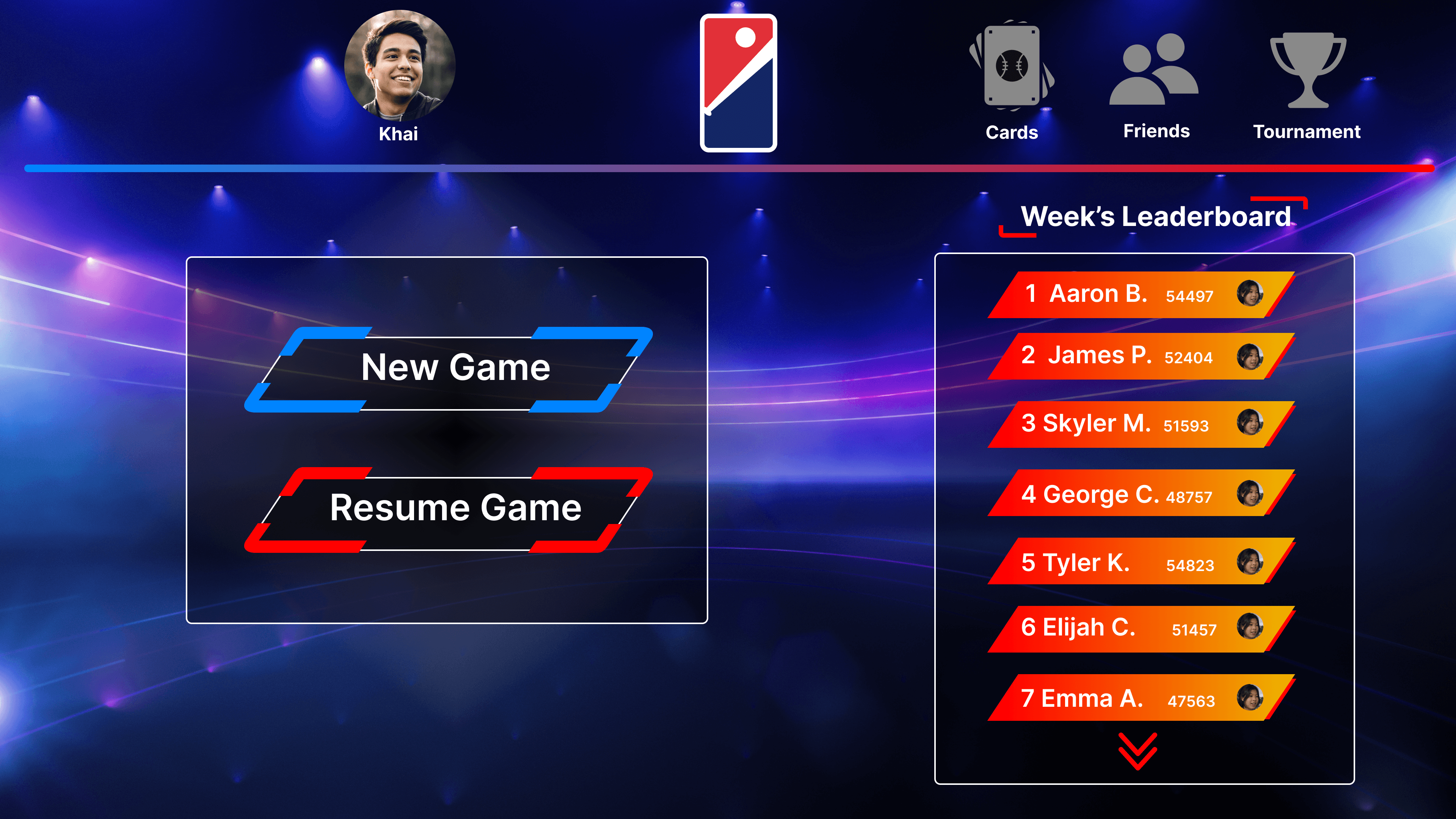 The game launch screen is where users are presented with the option to either start or resume games, while also being able to view the leaderboard for the week's top players. Other features that can be accessed from this screen include trading cards, the ability to connect with friends, and participation in tournaments.