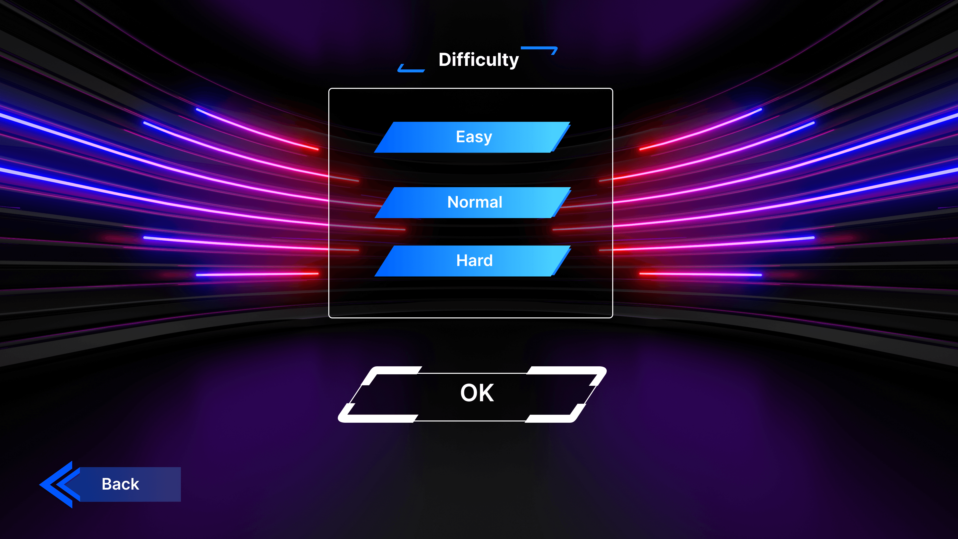 The setup menu screens allow for customization of game settings such as difficulty levels, handedness, and choice of music when starting a new game.