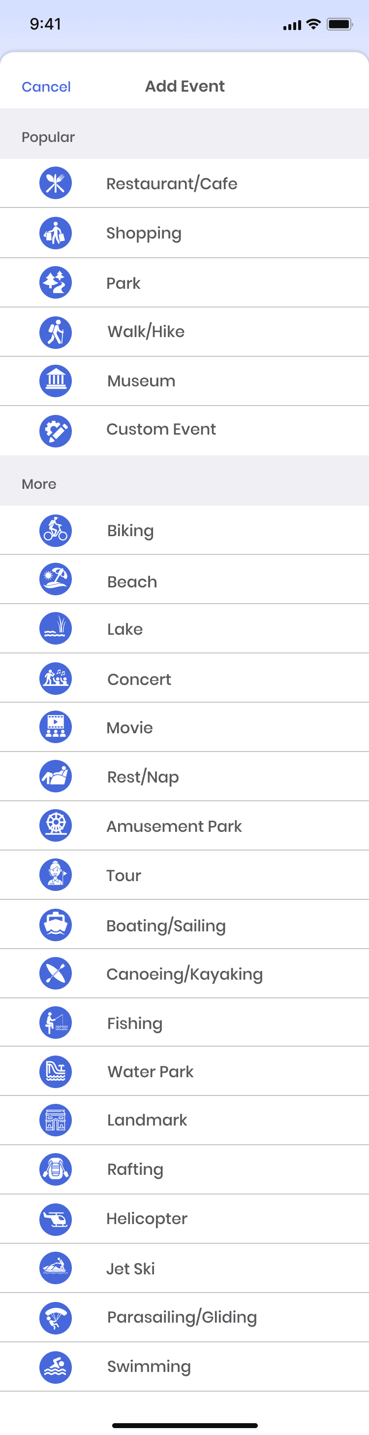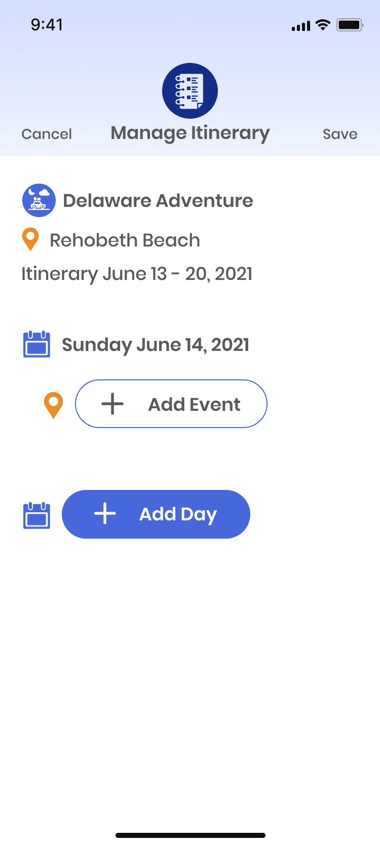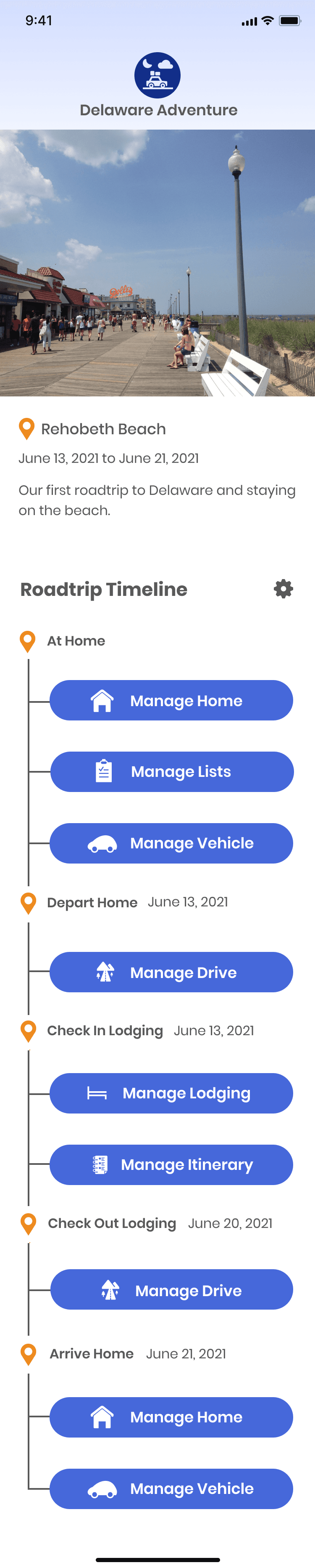 · The app uses a timeline as the principal organizing feature to present the different phases of a road trip, enabling users to visualize their journey from beginning to end.