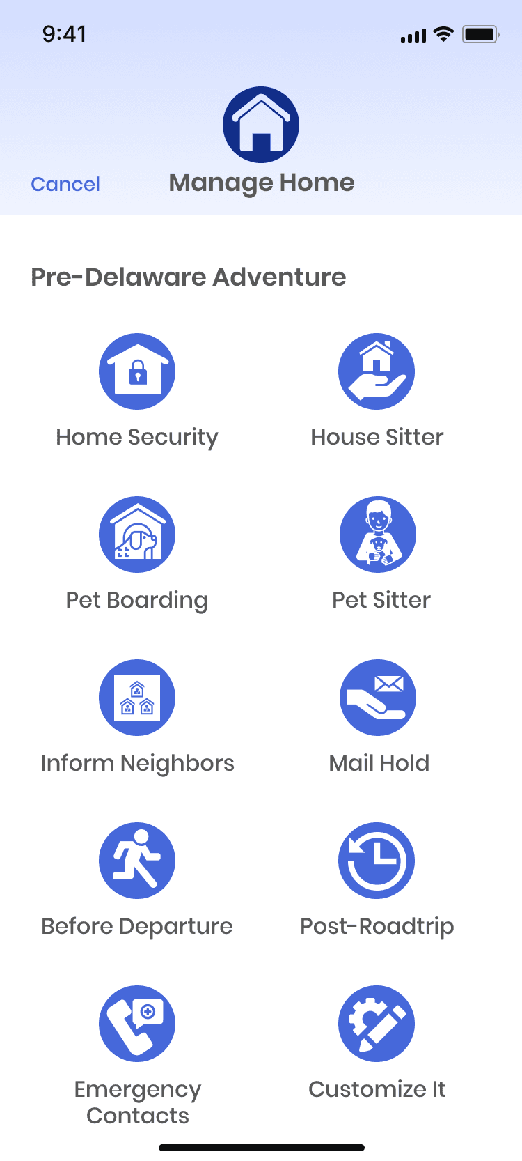 "Manage Home" function button provides access to all aspects of the trip that relate to one's home
